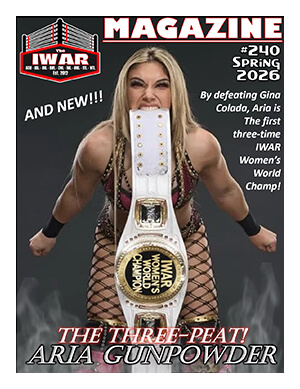 "The 240th edition of the IWAR Magazine features the top female wrestler in the IWA, Aria Gunpowder. At the BWL's premium postal event, Caged Fury 4, she had one of the greatest nights in IWAR title history: first, she defeated Brenda 'Bring Da' Payne to become the winner and champion of the inaugural Wildfire Betty Red tournament. Then, she and Rachel van Dorn defeated Brenda and The Queen Gina Colada to capture the IWAR Women's World Tag-team titles, ending the two-and-a-half-year-long reign started by Gina and Betty Thanu when they won the BWL Tag-team Cup in October of 2023! Finally, in the main event, Aria defeated Gina to capture the IWAR Women's World Championship for a record-breaking third time, truly setting Aria Gunpowder among the best there is in the IWA!